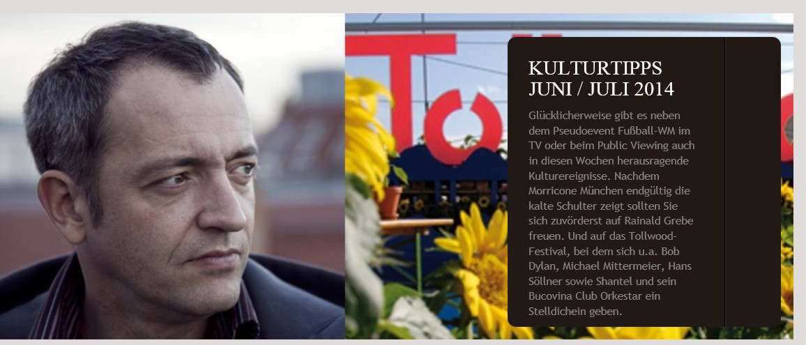 Glücklicherweise gibt es neben dem Pseudoevent Fußball-WM im TV oder beim Public Viewing auch in diesen Wochen herausragende Kulturereignisse. Nachdem Morricone München endgültig die kalte Schulter zeigt sollten Sie sich zuvörderst auf Rainald Grebe freuen. Und auf das Tollwood-Festival, bei dem sich u.a. Bob Dylan, Michael Mittermeier, Hans Söllner sowie Shantel und sein Bucovina Club Orkestar ein Stelldichein geben…