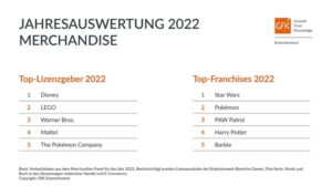 Basis der Auswertung sind die Verkaufsdaten aus dem Merchandise-Panel für den Zeitraum Januar bis Dezember 2022. Berücksichtigt wurden Lizenzprodukte der Entertainment-Bereiche Games, Film/Serie, Musik und Buch in den Absatzwegen stationärer Handel und E-Commerce.
