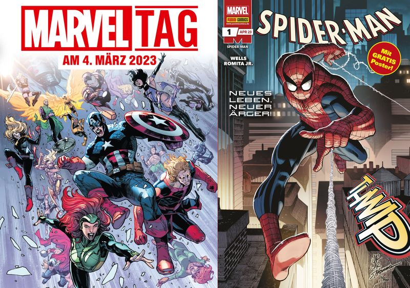 “Top-Autor Zeb Wells und Zeichner-Legende John Romita Jr. haben die Welt von Spider-Man bereits in mehreren Epochen geprägt. Nun beginnen sie ein neues Kapitel für Peter Parker, Mary Jane und andere Fan-Lieblinge aus dem Umfeld des beliebten Wandkrabblers, und warten mit vielen Veränderungen und Überraschungen auf.” So kündigt der schon lange nicht mehr “nur” für Fußballbildchen und Co. beliebte Verlag das 52-seitige Heft Spider-Man #1 (5,99 Euro, ab 7. März offiziell im Handel, schon am 4. März bei den Shops, die am “Marvel-Tag” 2023 teilnehmen) bringe einen kleinen Zeitsprung mit sich, “der nicht nur Spider-Man neu definiert, auch Peter Parker hat sich verändert – er hat einen neuen Job und sieht sich privat mit ganz neuen Problemen konfrontiert: Unter anderem spricht Tante May nicht mehr mit ihm, und die Fantastic Four und Avengers zeigen Spider-Man die kalte Schulter … die Frage ist: Warum?”